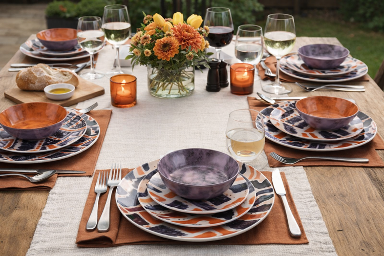 The Malindi collection by VdE brings the charm of Afro-chic style to the table, blending tradition and modernity. Characterized by original ethnic decorations, this dinnerware set stands out for its warm, vibrant colors: brown, orange, black, and purple. Each piece tells a story of faraway lands, creating an exotic and refined atmosphere. Dishwasher and microwave safe, the Malindi set, made entirely of porcelain, combines the beauty of ethnic craftsmanship with the functionality required by the contemporary table, transforming every meal into a sensory journey.