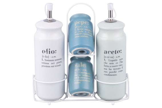 | Victionary Ocean seasoning set Ceramic Matte finish 204 stainless steel stand Oil and vinegar pot with 204 stainless steel spout and plastic (PP) drip saver cap Salt and pepper doses with silicone end cap Condiment set consists of: oil jug, vinegar jug, salt dosa and pepper dosa Decoration with Victionary definition of "oil," "Vinegar," "Salt, "Pepper" Oil and vinegar cruet capacity: 320 ml Salt/pepper dosa measures: Ø 5 x h. 8 cm Measurements oil/vinegar cruet: Ø 6 x h. 20 cm Stand measurements: l. 20 x p. 7.2 x h. 18 cm Dishwasher safe Color: black stand, white, light blue, light blue octanium dispensers |