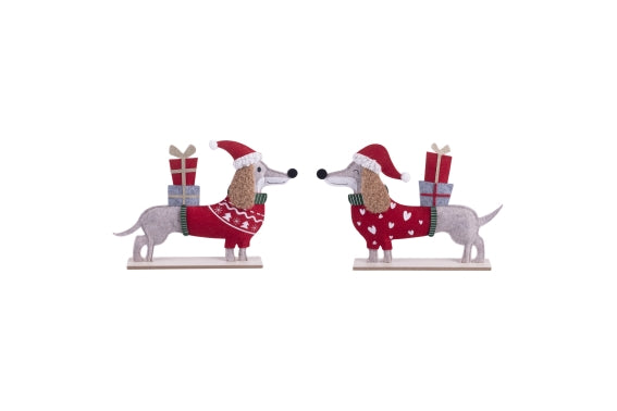 | Christmas decoration Made of MDF wood and felt (100% polyester) Decoration with gift parcels Little dog with Christmas sweater Fluffy ears Dachshund size A: l. 39 x d. 5 x h. 28 cm Dachshund B size: l. 41.5 x w. 5 x h. 29 cm Available in 2 assorted decors: dachshund with heart sweater, dachshund with Christmas sweater Wipe clean with cloth Warning: this item is not a toy but a collectible/decorative product intended for an adult audience, and therefore does not fall under the provisions of Legislative Decree No. 54/2011. Keep out of the reach of children. This product is to be used for intended use only; the Company is not liable for any misuse. |